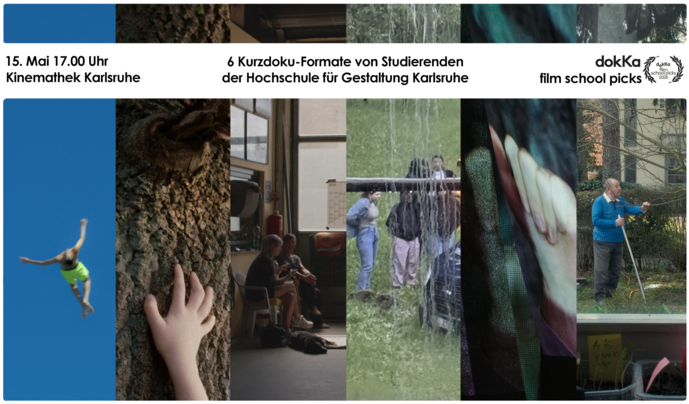 Unter dem Titel „Filmschool Picks“ präsentieren Studierende des Studiengangs Medienkunst der Hochschule für Gestaltung Karlsruhe im Rahmen des DOKKA – Dokumentarfestival Karlsruhe ein Programm aus sechs dokumentarischen und essayistischen Kurzfilmen sowie Hörstücken. Mit Arbeiten von Pauline Cemeris, Caroline Hellwig, Lea Möscheid, Luise Peschko, Tibor Pilz, Sophie Reißfelder, Sebastian Schönfeld und Rokas Wille.