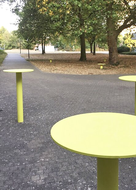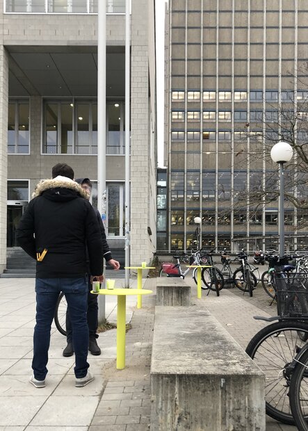 From temple of knowledge to homeless shelter and from cruising spot to silence center, libraries have many faces and functions in our society. And their role keeps changing. To address these changes the libraries of Karlsruhe have the ambition to redefine themselves and develop into digital learning platforms. The HfG Karlsruhe has been asked for interventions for the public outside space of five of the biggest libraries in Karlsruhe. The interventions should make their transition visible and usable, serving as functional signifiers of the exchange of knowledge and information and as tools for human interaction in the public sphere.