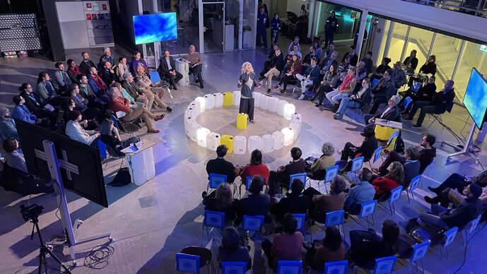 Die Inszenierung bringt reale Wissenschaftler:innen, Performer:innen und Bürger:innen im Modus eines fiktionalen Ministeriums in Austausch – und mit ihnen die Fragen: Wie lässt sich Zukunft verhandeln, wenn sie längst begonnen hat? Was bedeutet Teilhabe, wenn die Katastrophe strukturell geworden ist? Und wie kann Raum für solche Aushandlungen heute aussehen?