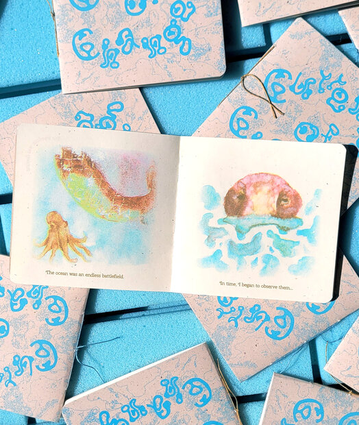 „Currents of Change“ ist eine Eigenproduktion von Jessica Kessler, entstanden während ihres Praktikums beim Studio Riso Pop in Amsterdam. Das selbst geschriebene und illustrierte Zine erzählt die Geschichte eines Oktopus, der sich auf der Suche nach Freiheit verändert – als poetisches Sinnbild für den Kampf ums Überleben in einer unsicheren Welt.
