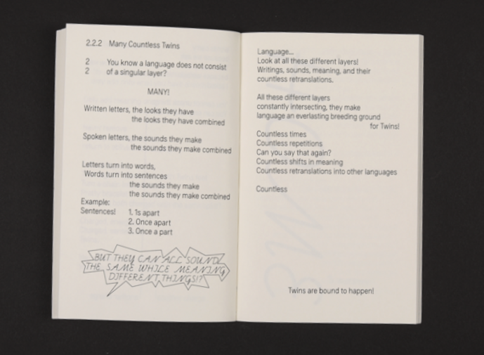 "Twins!", das Buch, ist eine Meditation eine Meditation über eine biegsame, in Worte gefasste Realität und ihr nuanciertes, aus einer Vielzahl von Schichten und Eigenschaften.