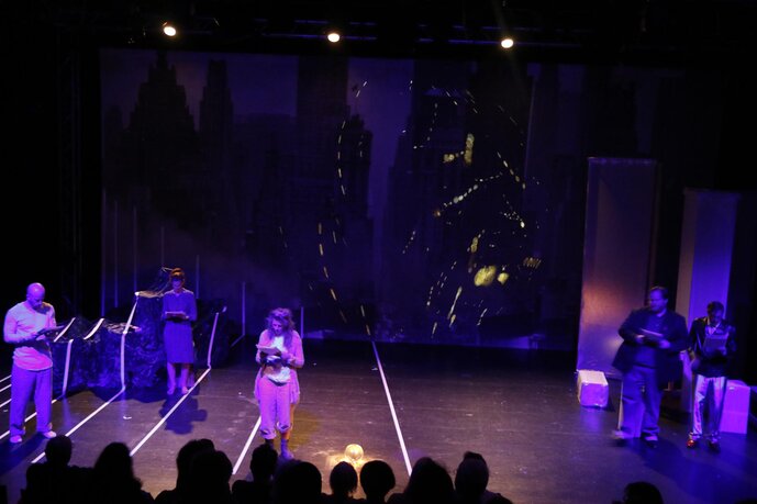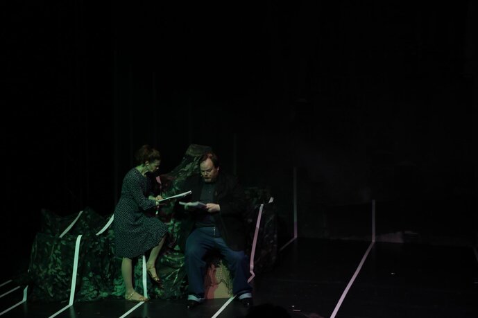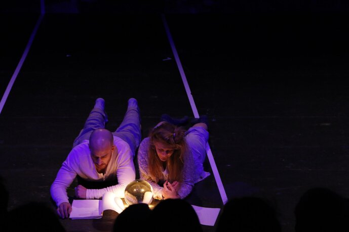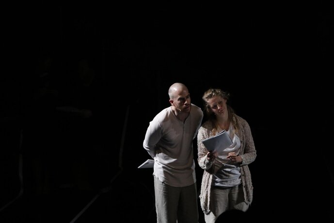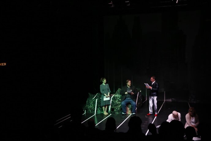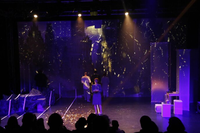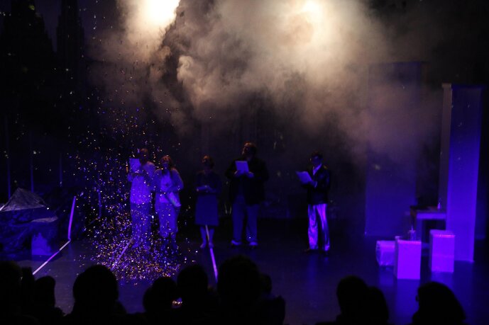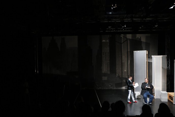 Szenen- und Kostümbild für das Stück „Worte“, gespielt auf der Studiobühne des Karlsruher Staatstheater.