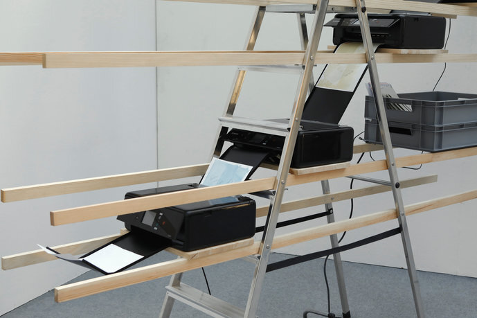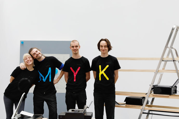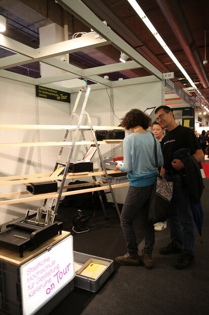 Vor Ort wurden auf einer kleinen Produktionslinie Notizbücher hergestellt, die Informationen über unsere Hochschule enthalten und der Öffentlichkeit angeboten wurden. An unserem Stand waren neben C, M, Y und K eine Leiter, vier synchronisierte Tintenstrahldrucker, ein V-Plotter und ein Booky-Wooky zu sehen.